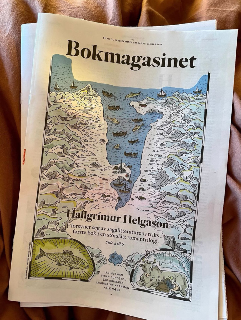 In addition to glowing reviews, Hallgrímur was featured in a major interview in the literary supplement of Klassekampen, which sported a cover photo of Segulfjordur, the setting of the books. He also appeared as a guest on the popular morning show on TV2.